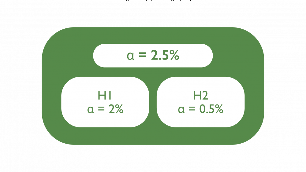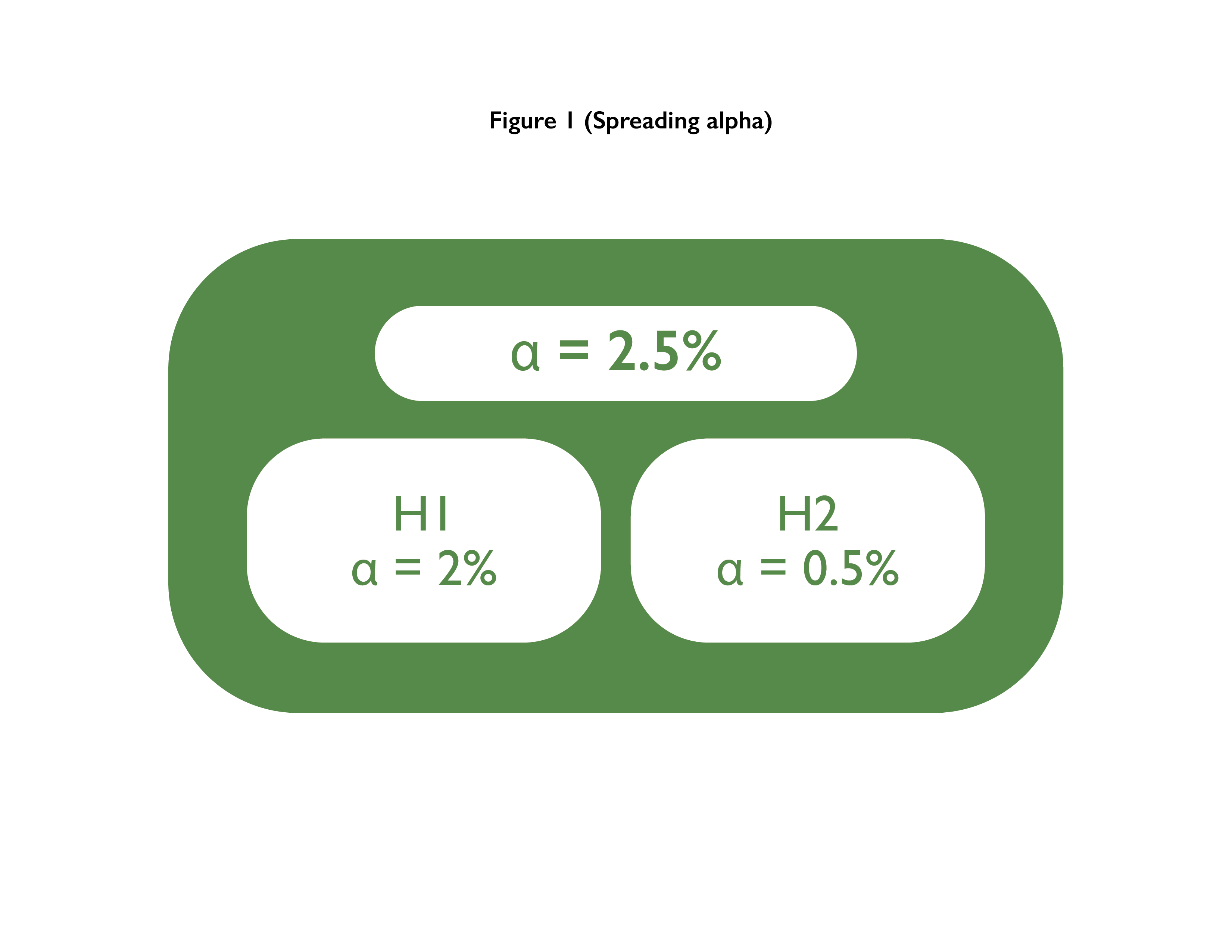 - Bonferroni correction/spreading alpha: Here the “alpha is spread across multiple tests”. Alpha stands for the Type-1 error. In our example from above, if two hypotheses were to be tested, then the alpha of 2.5% could be spread between them. E.g., both could be tested at 1.25%, or one could be tested at 2% while the other one could be tested at 0.5%. [Figure 1]
