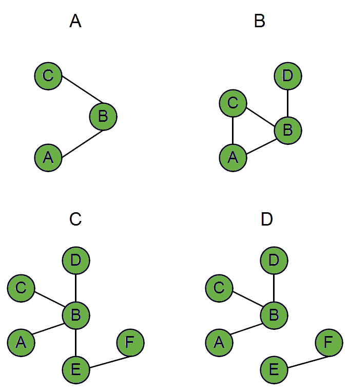 There is no limit to the number of treatments, trials and patients that can be included in a network meta-analysis. However, in order to conduct a standard network meta-analysis, the treatments should form a connected network, such that there is path from each treatment to every other treatment in the network. In Figure 1, diagrams A, B and C all illustrate connected networks. However, diagram D illustrates a disconnected network – there are no trials that connect treatments E and F to the rest of the network. We will look at how to handle disconnected networks in a future blog post.