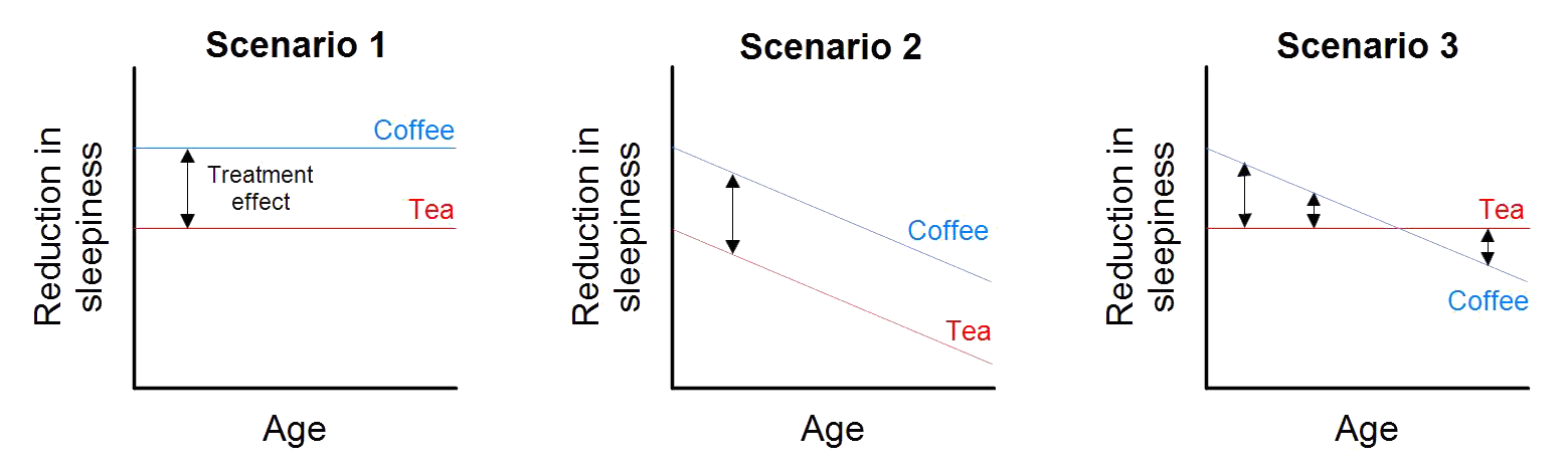 Figure 1 illustrates three scenarios for the relationship between the treatments (tea and coffee), the outcome (reduction in tiredness) and age. In Scenario 1, age doesn’t affect treatment response for either tea or coffee, hence there is also no impact on the treatment effect. In Scenario 2, age reduces the response to both tea and coffee, but note that the relationship is the same for each treatment, and hence the treatment effect is constant. In Scenario 3, age again reduces the response to both tea coffee, but note that in this case, age has a greater impact on coffee. In this case, the treatment effect depends on age. For Scenarios 1 and 2, we would say that age is not a treatment effect modifier. In each of these cases, it would be appropriate to conduct a meta-analysis that combines studies of young patients with studies of old patients. For Scenario 3, we would say that age is a treatment effect modifier – studies of young patients indicate that coffee is more effective, but studies of old patients indicate that tea is more effective. It would not be appropriate to conduct a meta-analysis that combines studies of young patients with studies of old patients (a better approach would be to use a meta-regression, but that’s a topic for another post!).