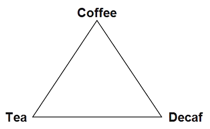 In network meta-analysis, we want all of the trials in the network to be similar with respect to any characteristics that are potential treatment effect modifiers. This assumption can be broken down by looking separately at each of homogeneity, transitivity (similarity) and consistency. In order to illustrate these concepts we expand our tiredness example to include a control, decaffeinated tea or coffee. Figure 2 provides a network diagram – it shows that, as well as coffee versus tea trials, there are also trials of coffee versus decaf (coffee), and tea versus decaf (tea).