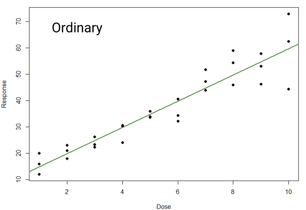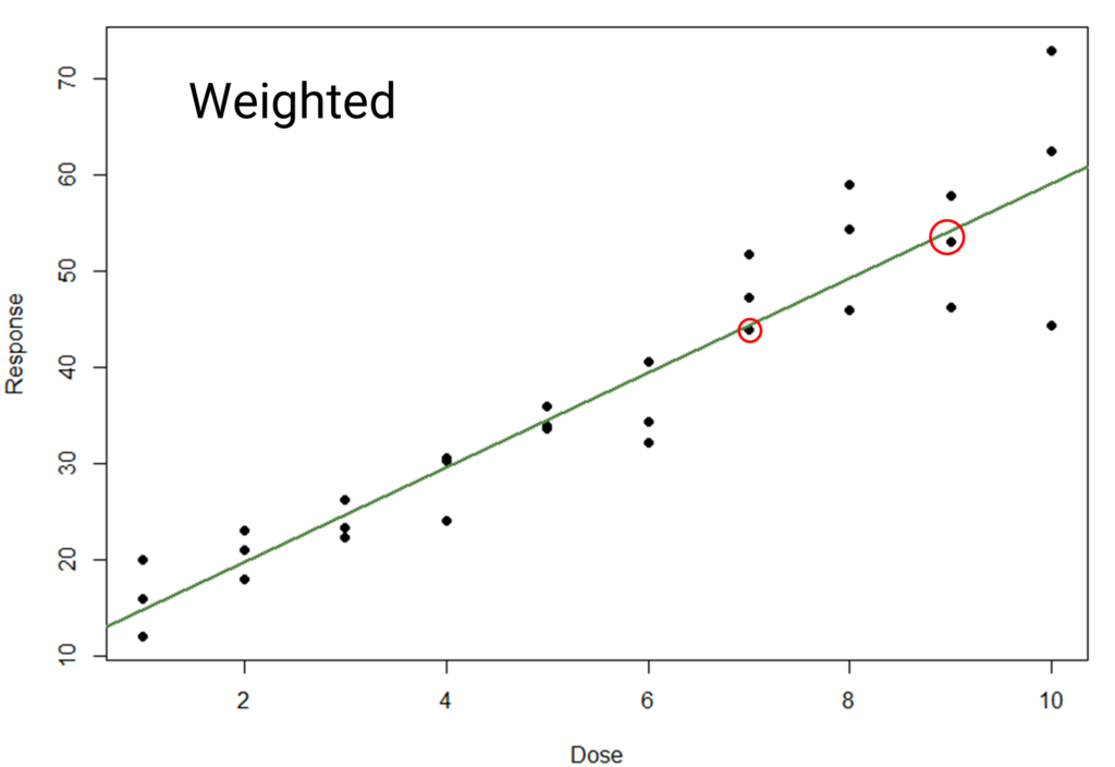 So, what do we do in such cases? Thankfully, we have options. One of these is response weighting: a process where we apply multipliers in the model fitting process such that dose groups with higher variance have less influence on the final model than those with lower variance.